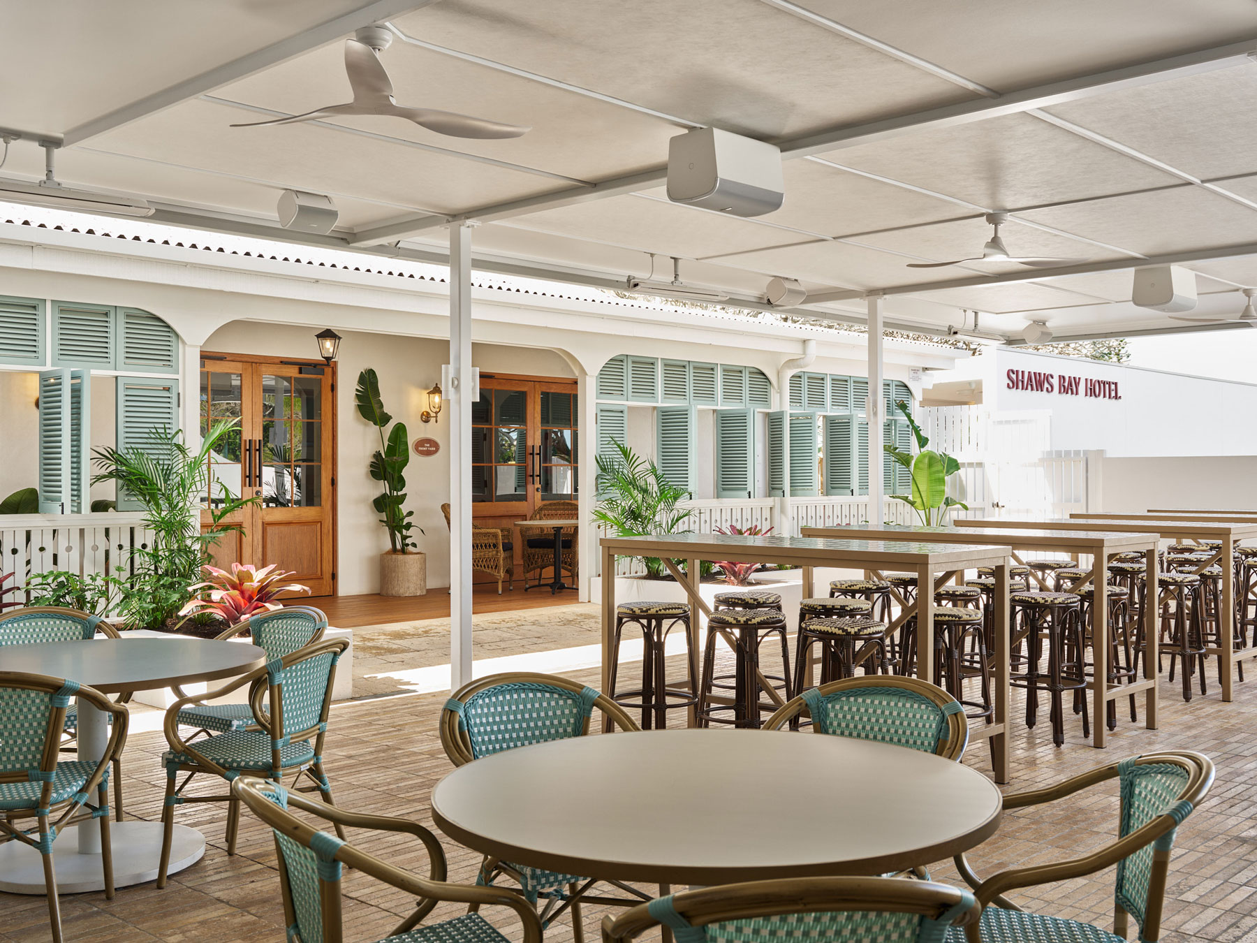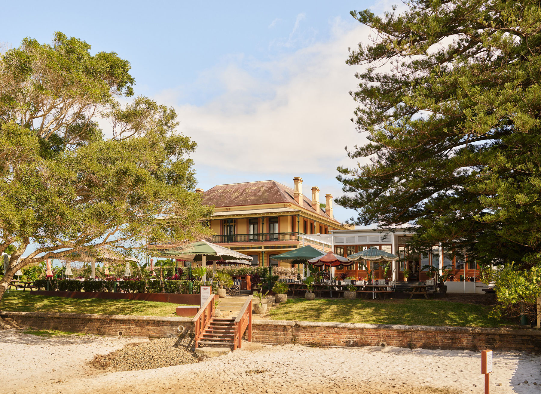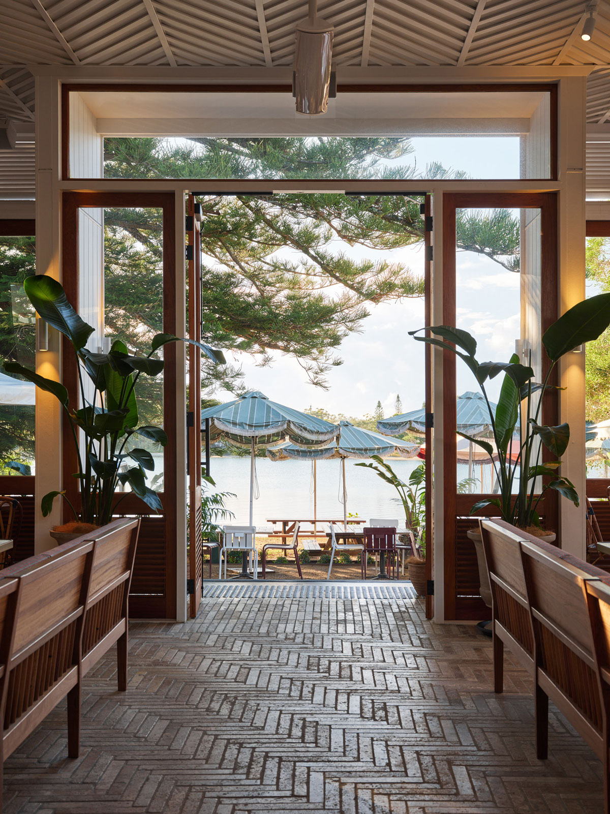 Views of Ballina’s ocean inlet are now prioritised via a centralised entrance that links a public bar, bistro, terrace and courtyard along its axis, spilling onto a beer garden that laps its shores. New solid timber hardwood beams and timber doors, plus Blackbutt floors provide a framework for marine themes to float. Inset tile patterns migrating from floors to table surfaces nod to Fenwick House, a Victorian mansion built circa late 1800’s that we restored externally. Newly integrated amongst the sprawling site, outdoor settings are tonally tethered to its rejuvenated façade.